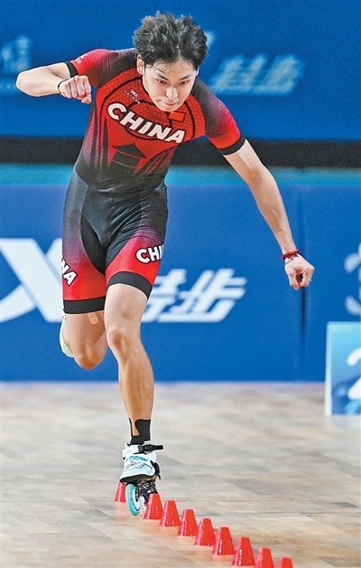 艺术与体育舞蹈类项目 中国队运动员付裕在自由式轮滑男子速度过桩决赛中。 新华社记者 谢剑飞摄