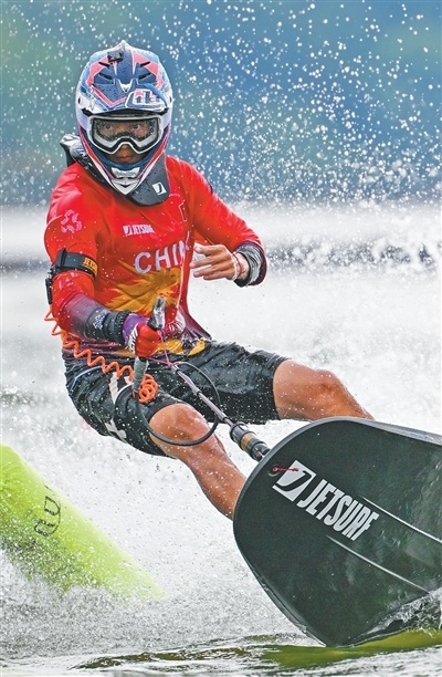 潮流类项目 中国队运动员张茂竹在摩托艇男子动力冲浪板决赛中。 新华社记者 孙凡越摄