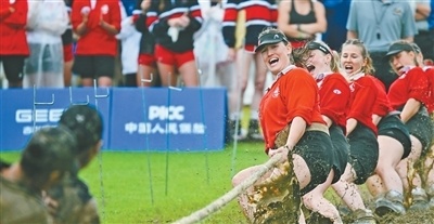 力量类项目 瑞士队运动员在女子室外拔河500公斤级比赛中。 陶 轲摄