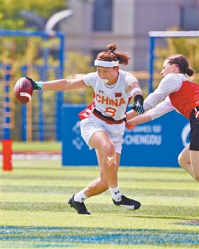 bsports体育球类项目 中国队运动员(左)在腰旗橄榄球比赛中。 本报记者 蒋雨师摄