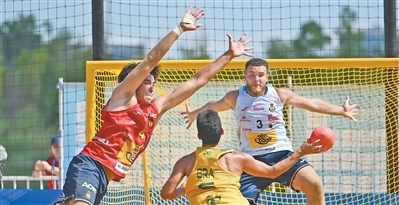 球类项目 西班牙队守门员(右)和队友(左)在沙滩手球男子铜牌赛中。 新华社记者 陈振海摄